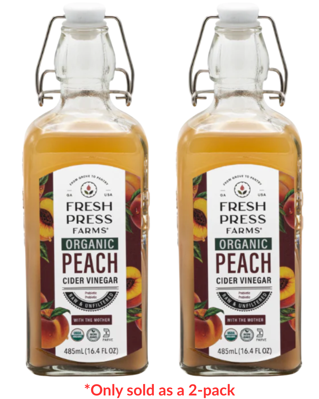 Fresh Press Farms Organic Peach Cider Vinegar is a better-tasting alternative to traditional Apple Cider Vinegar, offering the same benefits with a more approachable flavor. Made with organic peaches and crafted with care in Georgia, USA, our vinegar is raw, unpasteurized, unfiltered, and includes the “live mother.” It’s rich in prebiotics, probiotics, and enzymes that may help support digestion, regulate blood sugar, promote weight management, and enhance overall wellness.