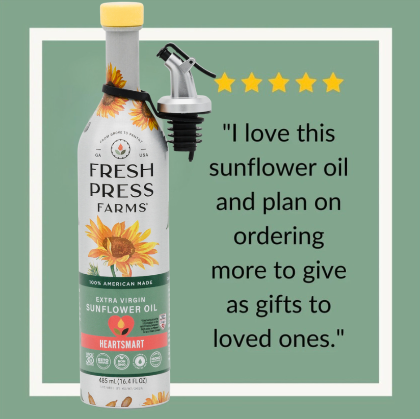 Our farm in Georgia is home to long, hot summers, and that’s just what Sunflowers (aptly named!) need to thrive. We source our sunflowers locally, then press them onsite in the same way we cold press our olives. This gentle process takes longer, but a healthier oil is always worth the wait. We start with only high oleic sunflower seeds, which are proven to benefit cardiovascular health. All oils are not created equal - that’s what makes us Fresh Press Farms.
